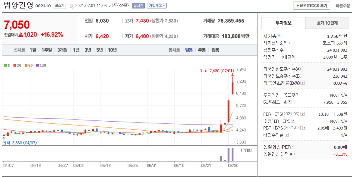 이와 관련해 일성건설과 범양건영의 주가가 수혜주로 떠오르며 강세를 보이고 있어요.