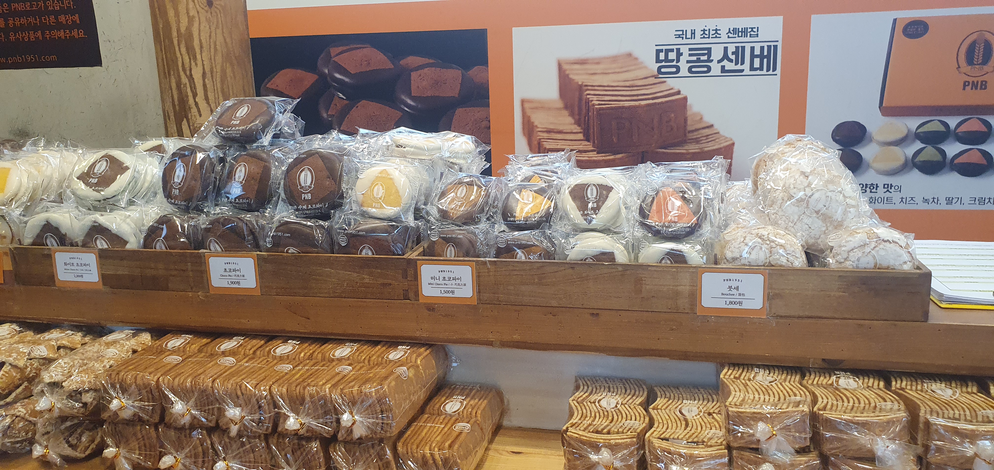 아래 사진처럼 다양한 맛의 초코파이들과 전병이 있고, 선물세트로도 만들어주시는 것 같았어요.