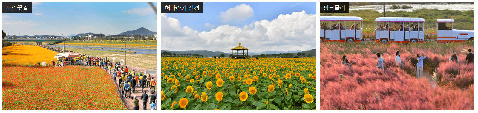 매년 10월이면 황룡강변 5만여 평에 황화코스모스, 핑크뮬리, 천일홍, 국화, 해바라기 등 10억 송이 가을꽃이 만개하고,