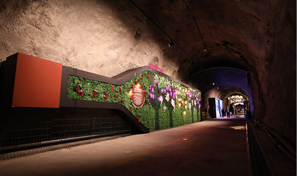 여기에 동굴이 생긴 건 무주양수발전소를 만들면서 터널을 뚫었기 때문이다. 작업용 터널이 2007년에 무주 머루와인동굴로 새롭게 태어났다. 동굴 길이가 총 579m인데 그중 290m를 사용하고 있다. 무주머루와인동굴 입장료는 2000원(시음장 무료 이용·음료 1잔 포함, 와인 족욕 별도), 이용 시간은 오전 10시~오후 5시 30분이다(월요일·명절 당일 휴관, 성수기는 월요일 정상 운영).