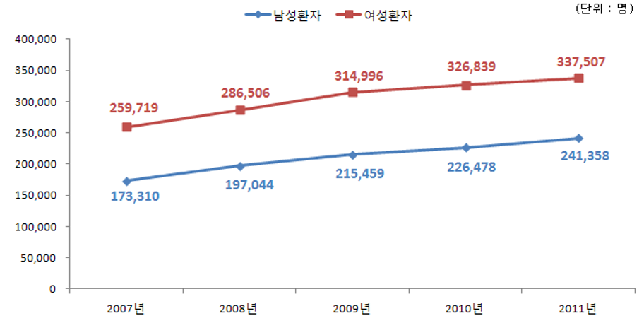 조금 오래된 데이터이긴 하지만 여성이 남성보다 1.4~1.5배 수준으로 더 많았다고 하는데요.