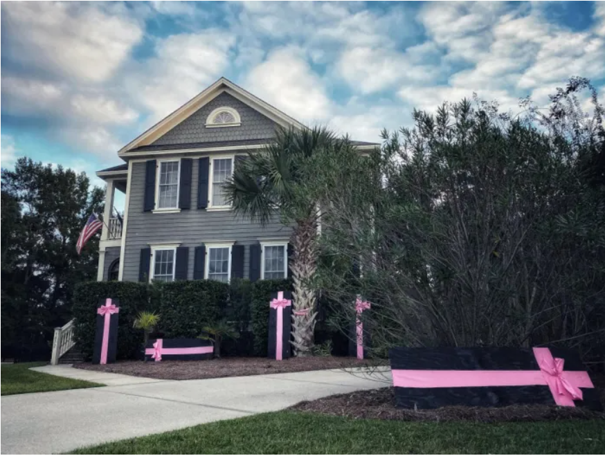 오징어 게임의 대표적인 소품 중 하나가 핑크 리본 장식이 달린 관인데 이 리본관을 직접 제작해 핼러윈 하우스 데코레이션을 완성해서 눈길을 끌기도 하였고, 핼러윈에 빠질 수 없는 호박 장식에도 동그라미 세모 네모 기호가 애용되는 것은 기본이라고 합니다.