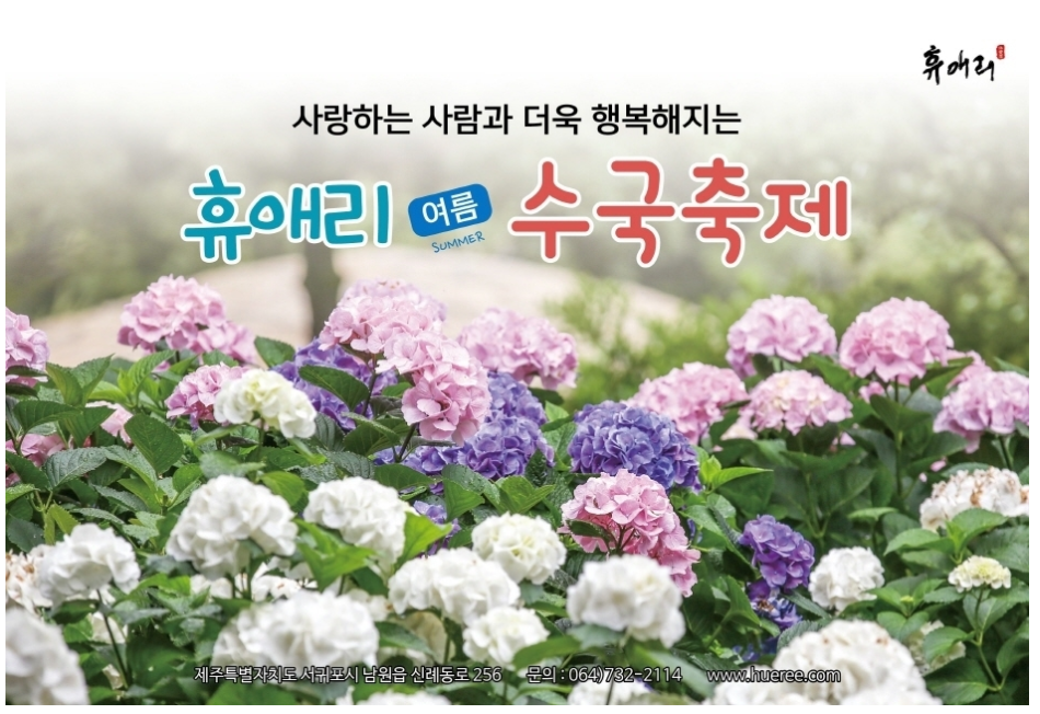 휴애리 여름 수국 축제는 정성스럽게 키운 다양한 수국을 온실, 수국 정원, 수국 오름 등 공원 곳곳에서 감상할 수 있어 제주도민과 관광객에게 인기가 좋은 제주 대표 축제입니다. 특별히 온실에서 다양한 수국을 만나 볼 수 있으며 공원 첫 입구부터 나오는 출구까지 전체가 수국으로 덮여있는 풍경을 자랑한다.