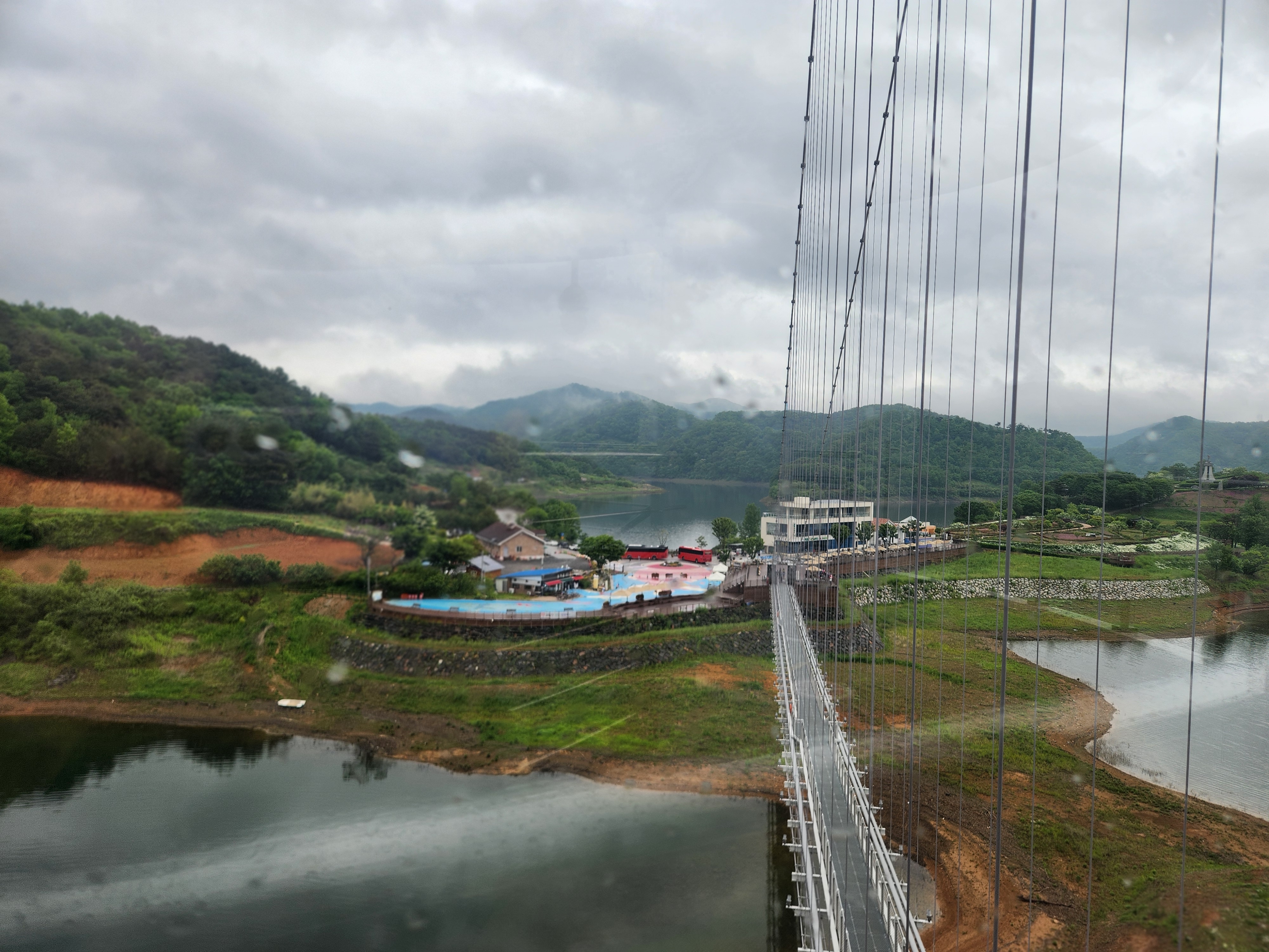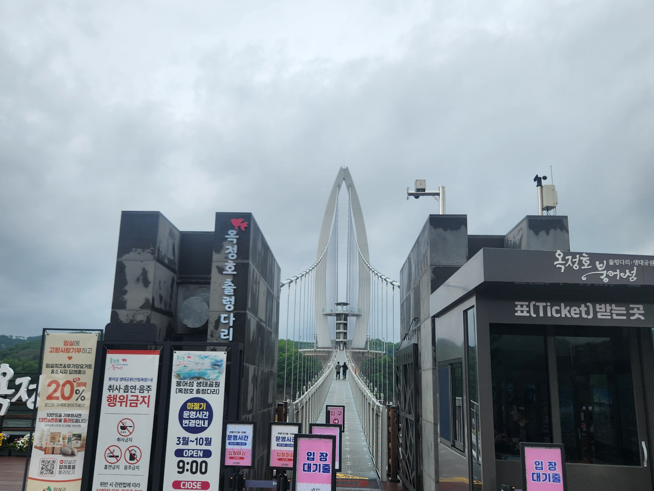 붕어섬에 들어가려면 아름다운 옥정호 위의 출렁다리를 건너야 해요
